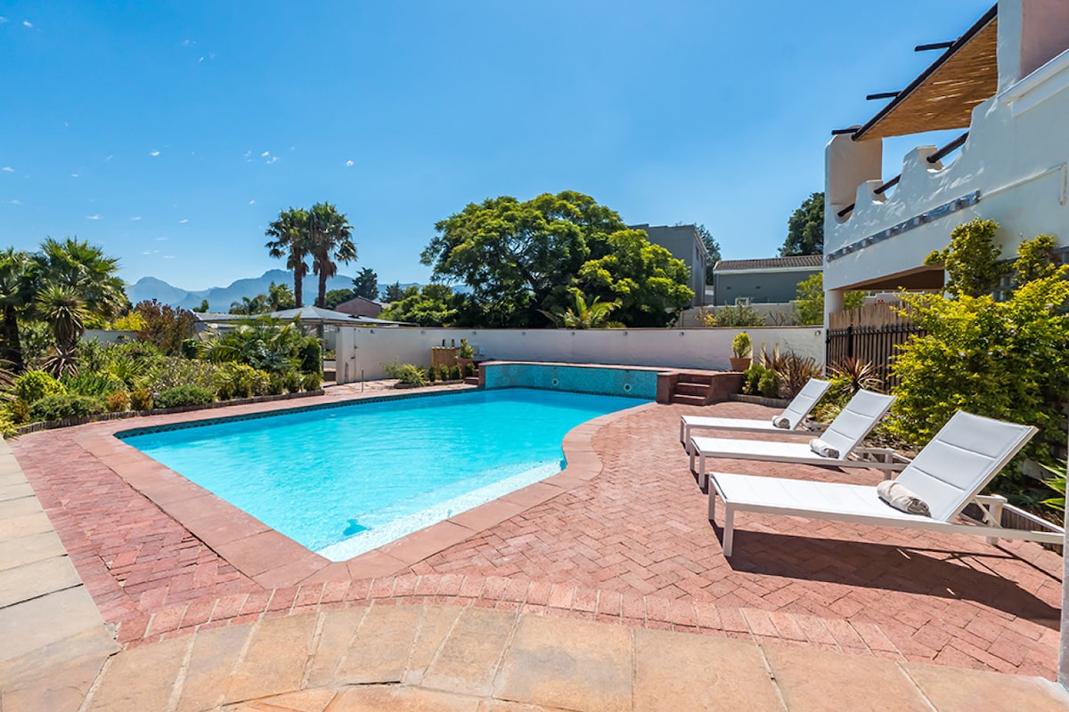 "NO Airbnb fees are added to the price you see" Constantia Klein Villa is a beautiful self-catering 4 bedroom ensuite house with private swimming pool , large covered patio and BBQ facilities. Surrounded by the tranquility of Groot Constantia, Buitenverwachting and Klein Constantia Wine Farms. Walk from the garden into the Groot Constantia Vineyards or to Klein Constantia Wine Farm.