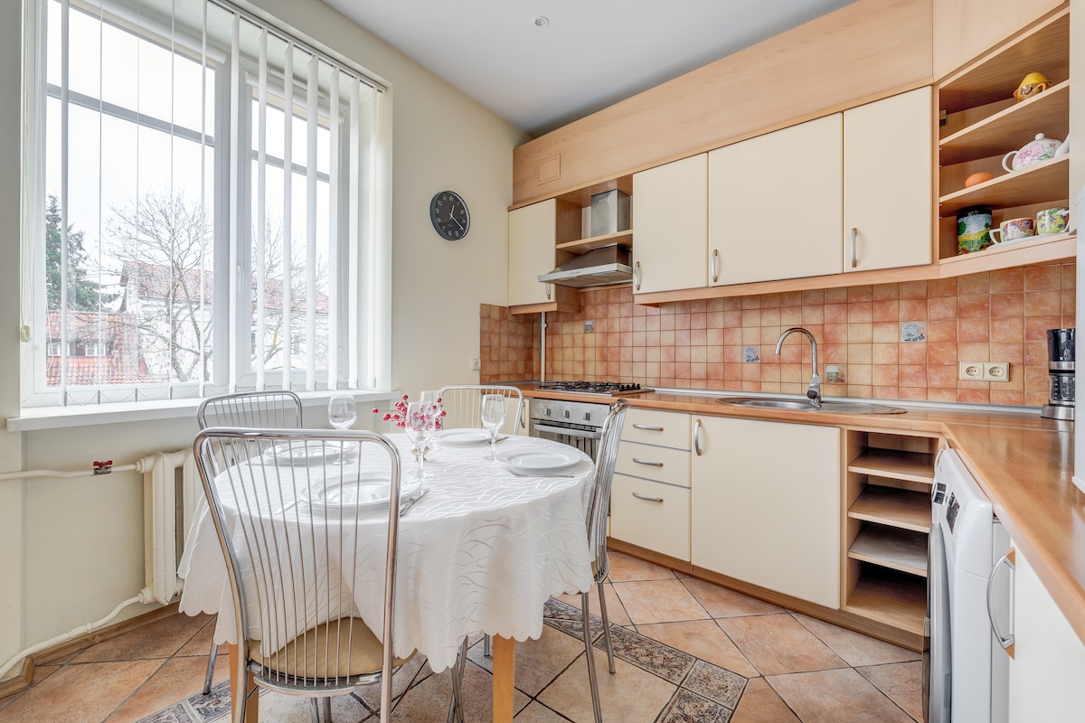 Newly decorated apartment in the heart of Užupis near the angel statue. 33sq.m. There you will find a bedroom with a large double bed, a bathroom, and a living room with a fully equipped kitchen. You can see the magnificent view of the city Vilnius through the windows and the music you play from the Gramophone will leave a cozy atmosphere in the apartment. Even though the apartment is located in the main street it is a quiet place to stay because the apartment is situated inside the yard.