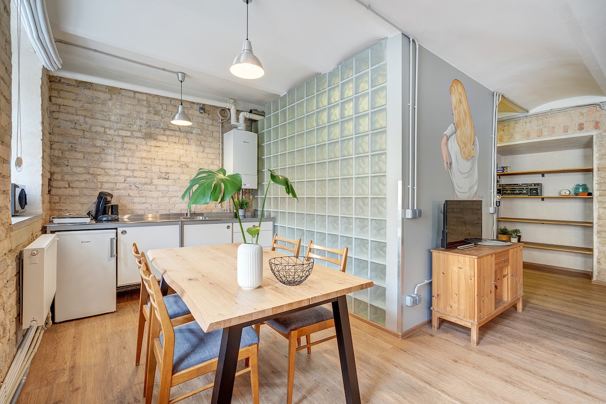 Newly decorated apartment in the heart of Užupis near the angel statue. 33sq.m. There you will find a bedroom with a large double bed, a bathroom, and a living room with a fully equipped kitchen. You can see the magnificent view of the city Vilnius through the windows and the music you play from the Gramophone will leave a cozy atmosphere in the apartment. Even though the apartment is located in the main street it is a quiet place to stay because the apartment is situated inside the yard.