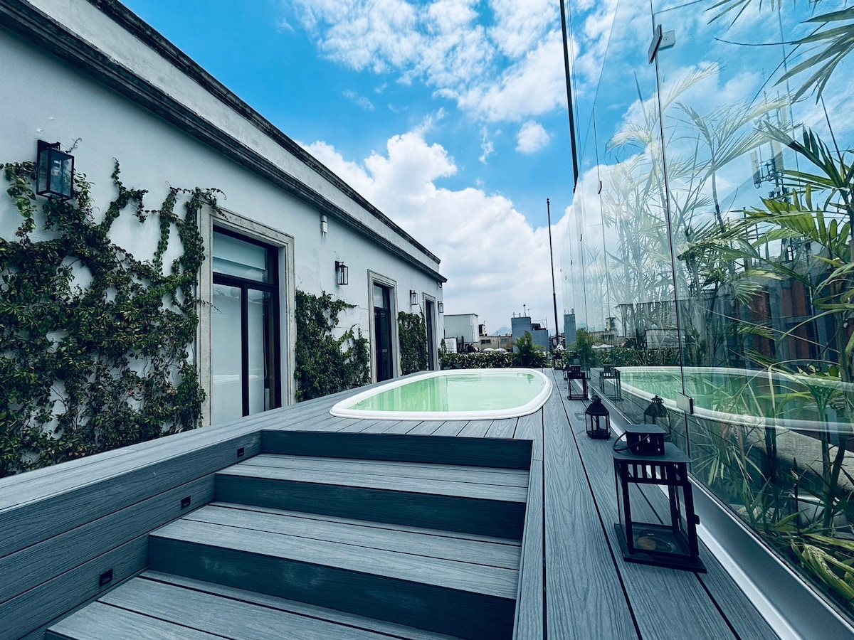 Nuestra suite cuenta con cama king, baño privado, cocina equipada, barra desayunador dentro de una armoniosa y confortable distribución, vista a la terraza y alberca en una ubicación excepcional a una cuadra del zócalo de la CDMX, en zona de boutiques como el Palacio de Hierro que abrió sus puertas en 1891, joyerías. En un día puedes visitar, la Catedral, Palacio Nacional, Palacio de Bellas Artes diversos museos y restaurantes "El Cardenal".