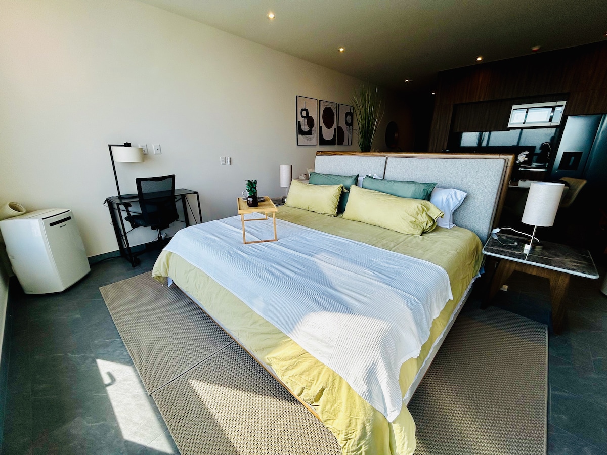 Amplio departamento en BeGrand Reforma, espectacular desarrollo con las mejores áreas comunes de la ciudad, alberca con vista inigualable. Lugar ideal para trabajar en tranquilidad, hacer turismo, trámites en la ciudad o escapada romántica. Es una cómoda cama king size, cocina equipada y espacio para hacer home office. Estarás muy cómodo!