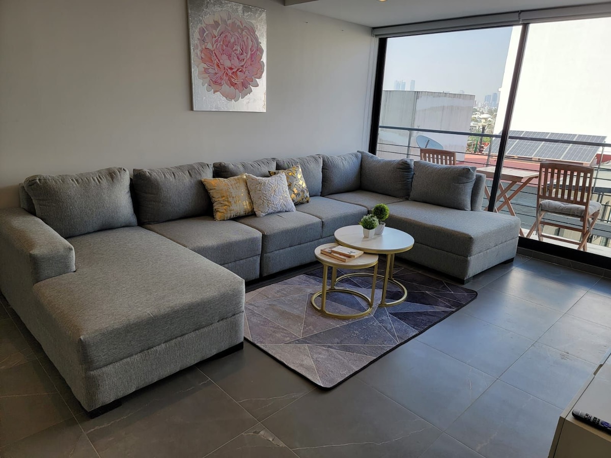 Desertic Chic CDMX公寓,可爱阳台和电视投影仪