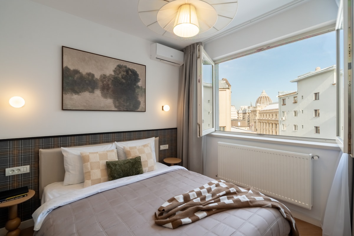This beautiful 1 Bedroom apartment is located in the heart of Bucharest, right next to the Old Town. Location wise it doesn't get any better than this. From the Terrace you have an amazing city view. The place is easily accessible by public transport (bus & metro). This bright flat was fully refurbished in the summer of 2023 with high standard materials and has all possible amenities available for a perfect stay.