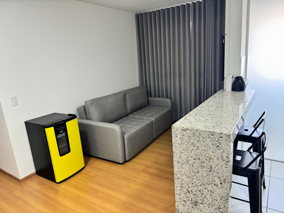 Apartamento novo, planejado para oferecer conforto e tecnologia. •1 quarto com cama de casal •Sala com sofá-cama confortável •Cozinha completa (exceto Air Fryer) •Internet de alta velocidade, ideal para home office e streaming •Estacionamento privativo .Elevador .Playground e espaço pet •Alexa com Apple Music •2 Smart TVs com Netflix e Globoplay •Roupas de cama e banho Taxa de limpeza inclui higienização completa e troca de roupas.