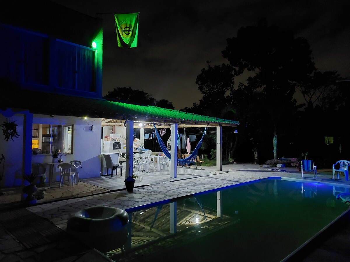 Viva uma experiência num lugar tranquilo e espaçoso para descansar ou trabalhar home office. Uma casa rústica com vários ambientes e muito verde e espaço externo inclusive para seu estimado pet. o espaço acomoda até 6 pessoas para dormir,. Com 1 cama de casal, 2 camas de solteiro, colchões extras, TV, cozinha equipada, ducha e redes para relaxar. O espaço é fechado, com garagem para 3 carros e cercado por pés de manga e pequizeiros e muita flores.