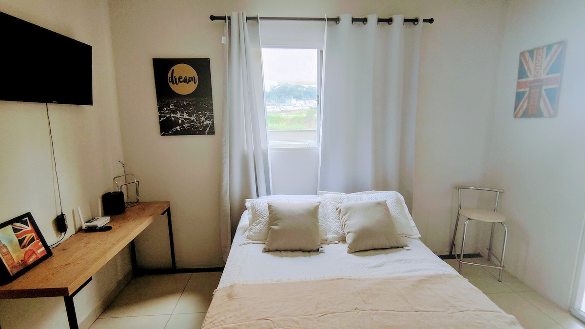 Organizado para que o hóspede se sinta em casa. Cozinha e banheiro equipada com armário planejado com bons utensílios domésticos e eletro portáteis. Apto possui uma área privativa. Também disponibilizamos uma Tv Smart. Internet fibra ótica (300MB). Colchoes com boa qualidade, lençóis e travesseiros de ótima qualidade, todos os quartos possui cortinas com blecaute. Tudo para que o hóspede tenha uma ótima noite sono e possa estar bem disposto no outro dia, pois queremos que se sintam em casa."