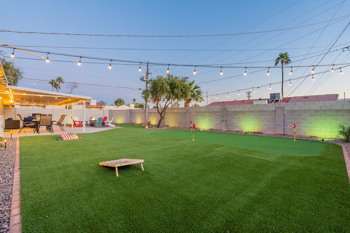 Bring your friends & family to this home for a fun filled vacation! Backyard has it all. mini golf, corn hole, gas fire pit, gas bbq grill, bocce ball, and plenty of lighting to enjoy the evening under the stars. This home has 3 bedrooms all with king size beds and 2 full bathrooms. The fully stocked kitchen and indoor/ outdoor dining spaces will be great to eat at home and play games. Relax on the large sectional couch to watch your favorite cable tv show or movie. 5 Min to Old Town Scottsdale