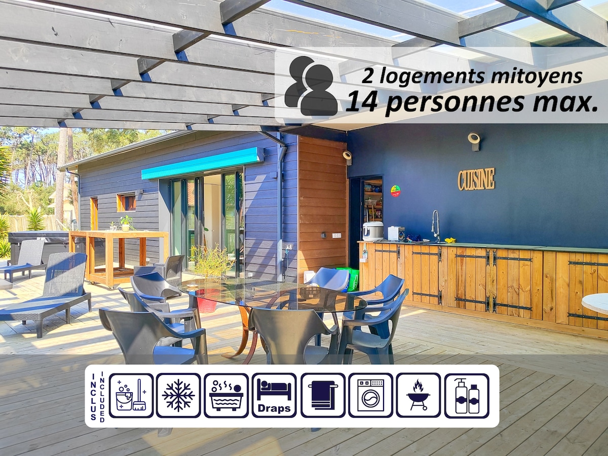 « KOLONAKI » Villa récente avec 200m2 de surface habitable, cuisine et salon 120 m2 ,vue sur la piscine chauffée sécurisée et forêt , ses 5 chambres 4 salles de bain , son jacuzzi 5 pax chauffé toute l’année et son coin plancha, douche et wc extérieur.parking de 3 places dans la propriété clôturée sécurisée . Située à 800 m des spots de surf, calme , discrète, en lisière de la forêt landaise( départ piste vtt . Localisation : 5 min à vélo des plages , 10 min voiture golf Seignosse