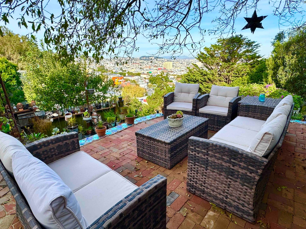 Located in the heart of San Francisco, atop beautiful Bernal Heights. This spacious bedroom has access to a private bathroom & has a double & twin size bed. Included is a unique parlor/kitchenette & lounge area which opens onto the Magical Garden. You will be treated to stunning Golden Gate Bridge & skyline views and can enjoy the stars from the outdoor soaking tub. The summit of Bernal Hill is at your door for a walk or run & offers a 360° vista of the city and unforgettable sunsets.
