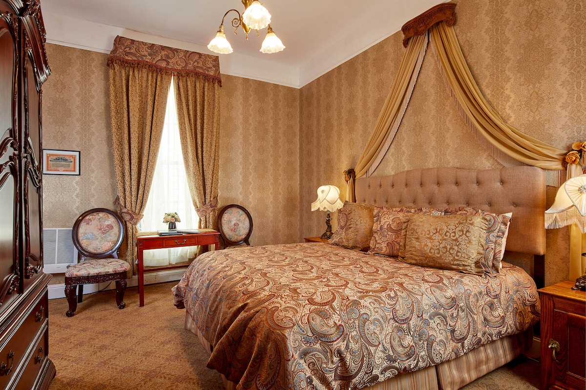Enjoy complimentary deluxe continental breakfast in the classy salon, where medallions feature imagery going back to the original Girl’s Finishing School. Evening tea & sherry service takes place in the fireplace-y parlor and library, complete with baby grand piano. Your room charge will be paid prior to your arrival. Note that an additional 1.26% Local Tax will be charged at check-in.