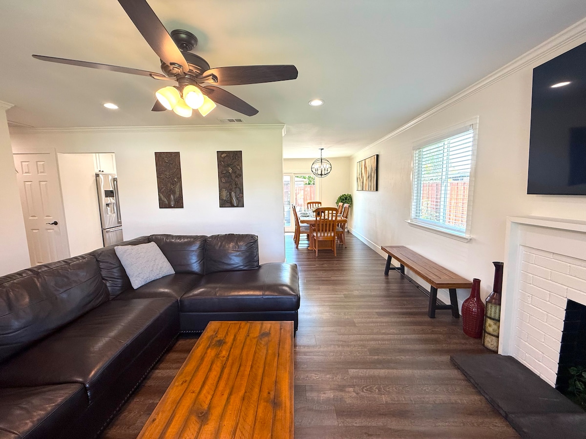 If you're searching for one of the premier Airbnbs in Walnut Creek, your search ends here! From the moment you arrive, you'll notice the attention to detail and exceptional value of this 2-bedroom, 1-bathroom home. It comes fully equipped for a first class experience. What truly sets this guesthouse apart is the wrap-around covered porch, featuring three ceiling fans, accent lighting, a gas BBQ, a fire table, a dining table adorned with a chandelier, as well as rocking and Adirondack chairs.