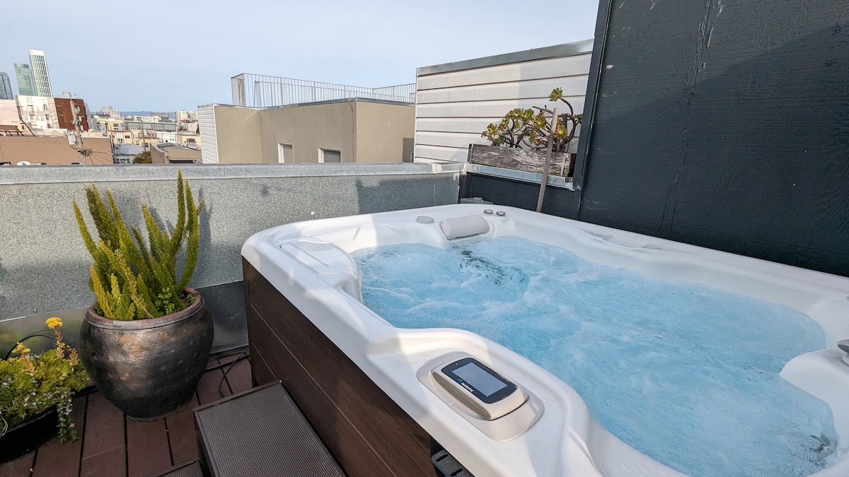 Escape to a stylish, newly remodeled spa-home! Our goal is to pamper you with the most luxurious mattress, linens, carefully chosen ergonomic furniture, steam sauna bathroom and a state of the art, new therapeutic private rooftop spa. Tucked on a quiet alley yet with immediate highway access and a private garage. Walking distance to Michelin star restaurants, quality eateries & designer shopping. Enjoy a fully stocked gourmet kitchen & soak in the San Francisco skyline from your private spa!
