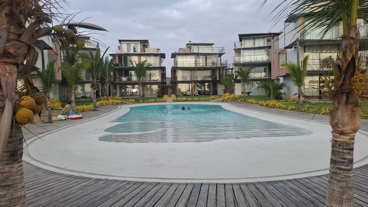Alquiler de departamento de 170 m2 dentro de un condominio exclusivo en Zorritos -Tumbes, alrededor de una piscina de 25 metros de largo de agua salada. Cuenta con 3 dormitorios con capacidad máxima por COVID para 7 personas. Ideal para 3 parejas o una pareja con varios hijos y familiares. Los 3 cuartos tienen AIRE ACONDICIONADO. La terraza, sala, comedor, cocina están integrados y son super luminosos. El mar es tranquilo, templado de aguas azules.Todo el año esta soleado 28 c