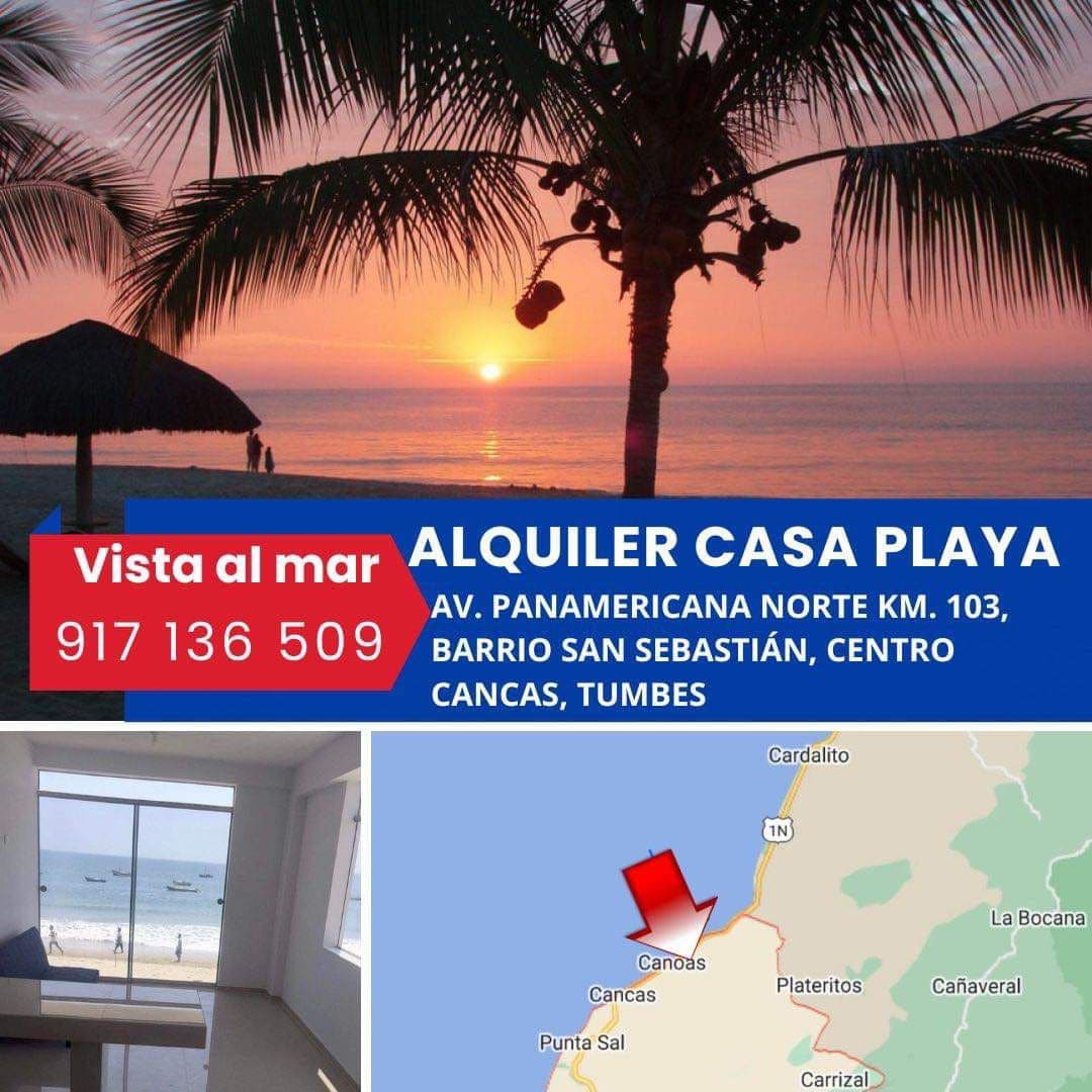 Beachfront apartment in a relaxed condominium in Huacura, Zorritos, Tumbes for rent. Located 57km south of Tumbes airport. Equipped with all appliances, beddings, etc. ready to receive up to 7 guests in 3 bedrooms, 2.5 bathrooms, private terrace, large shared pool and beachside bbq communal area, and direct access to the beautiful with stunning sunsets.