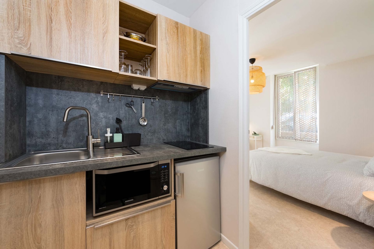 Appartement de 42 m² neuf ! Cuisine américaine toute équipée, salon/séjour avec canapé lit, tv écran plat, wifi... chambre avec literie de qualité, sdb avec douche à l'italienne,, sèche-serviettes électrique, wc, buanderie avec lave-linge, sèche linge... Situé en rdc, stationnement aisé devant l'immeuble. Environnement très calme et à 300 mètres des cures. L'appartement est très cocooning.