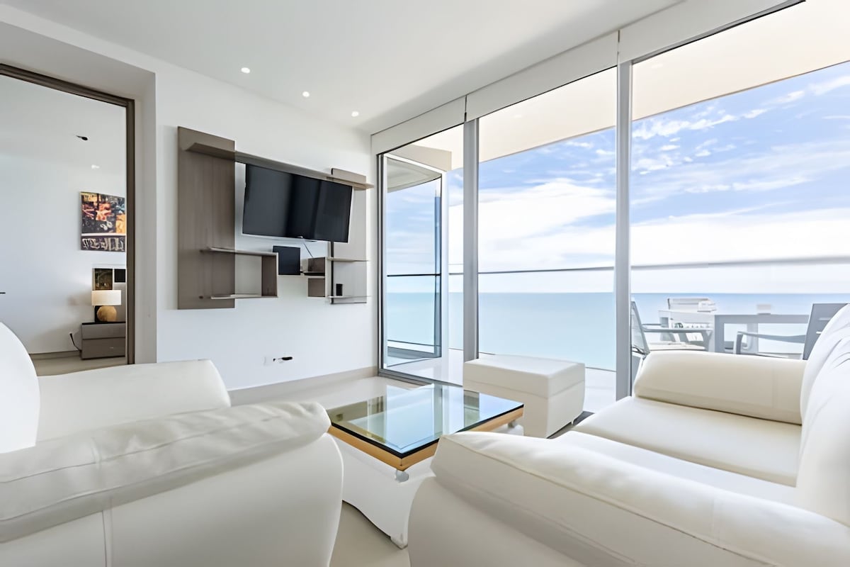 Exclusive 30th floor apartment Morros City with incredible and captivating sea and historic center views. Master bedroom with direct sea view and balcony access. Full kitchen, 2-in-1 washer and dryer, 60" Smart TV, 500MB fiber optic WiFi. Beachfront Bocagrande with luxury amenities: pool, jacuzzi, Turkish bath and gym. Free parking. Ideal for couples seeking the most exclusive experience from the highest available floor in all Cartagena