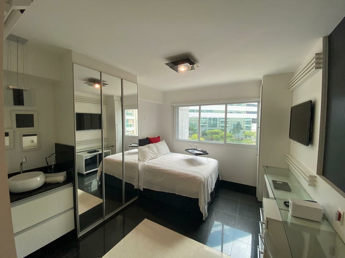 At the Cullinan Hplus Premium hotel. Very new and contemporary. Amazing location! Two malls across the street. Great tourist spots to go on foot. Charming, finely decorated and furnished unit. On the highest floor, with a beautiful view of Brasília and Asa Norte. 29m² luxury suite with king bed. Well equipped with several items for your convenience. Acoustic insulation on the windows for a great rest. Smart TV. Garage. Swimming pool, gym, sauna and restaurant. Check in 24 hours at reception.