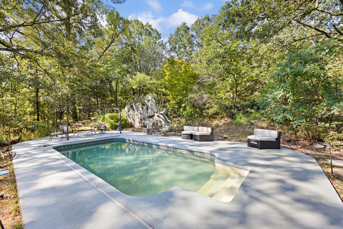 Bring the whole family and all your friends to enjoy this fully furnished rustic rock cabin nestled on 14 acres adjoining Petit Jean State Park. The children will love the rock wall-accessed play loft, the tree fort, trampoline, swing set, and Wii. Enjoy outdoor cooking in the rock fire pit or grill. Whether you need to bring the whole family, have a girls' getaway, want to scrapbook, plan a reunion, or anniversary, the Rock House Cabin can accommodate your needs. *Note: single steps inside*