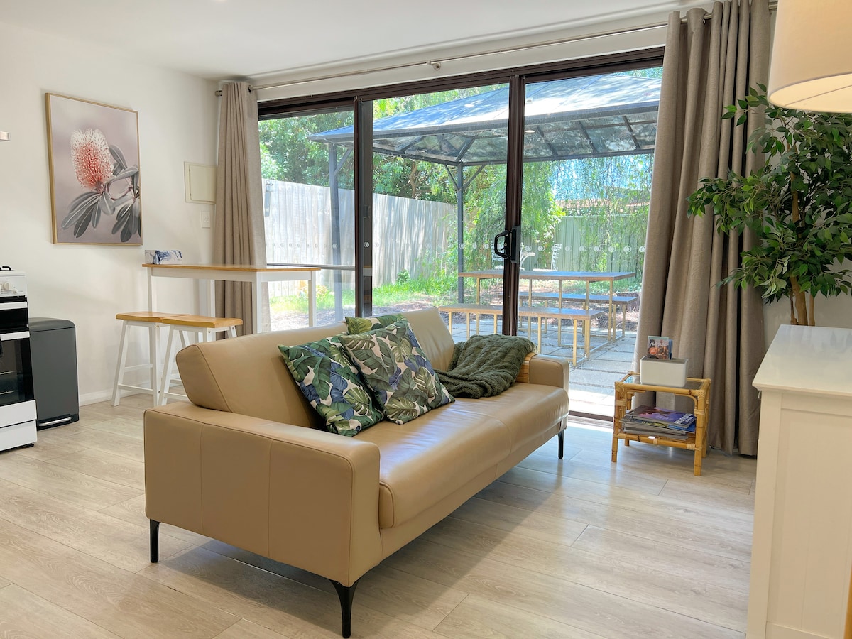 New funky Bali style villa. Beautiful indoor outdoor flow when opened up. Secure keypad card entry with undercover off street parking. Shared Swimming pool (heated - 3 season exc. winter) available on daytime hrs with waterfall feature. 2 Bedroom, TVs In all rooms with Netflix, Stan and Prime connected, Bluetooth wifi Stereo, Aircons to all rooms, indoor fireplace, small library New Addition ! Brand new Deluxe queen overflow room "Bedroom 3 - theroom" available as an extra charge