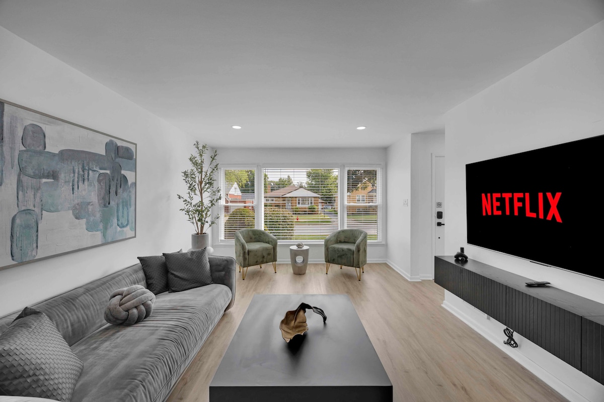 Experience the city in style at Retro Modern Bungalow, the perfect pad for up to 4 friends. Featuring two spacious bedrooms—each with a king bed and luxury linens—a propane fire pit and a fully fenced, pup-friendly backyard. Enjoy central HVAC, speedy WiFi, and a dedicated workspace. A pack-n-play crib is available at no cost. Central location just south of Oak Park, 15 mins from Midway airport, and 20 mins from downtown. Park for free in our garage or catch the train a few blocks away.
