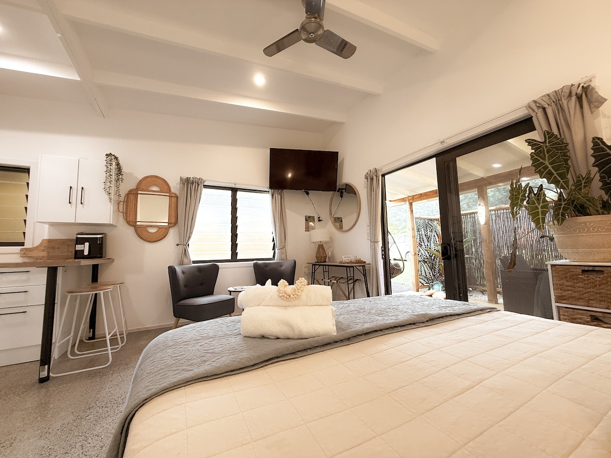 Nevaeh Garden Studio features an open plan layout opening out to the outdoor decking. Our home is complete with all the comforts of home, a 49" 4K Ultra HD Smart LED-LCD TV, 5.1 Channel 3D Blu-ray home theater system, stainless steel stove and fridge freezer. For the warmer days and nights, the use of the aircon comes in handy. We also have a rental car available for hire for $50 per day.