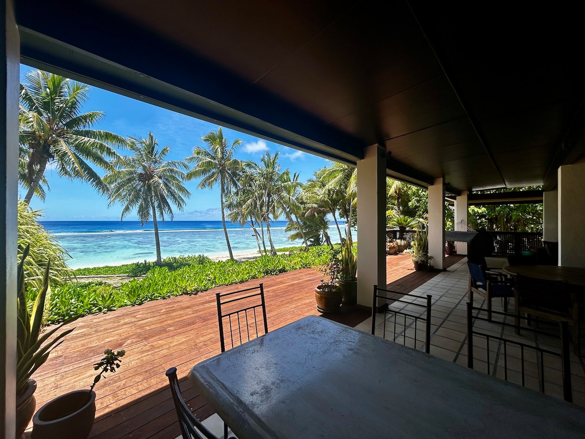 Our spacious beachfront villa is only a few steps away from the beach. There is a large veranda for dining and relaxing, that has a clear view of the ocean. The work of local artists are featured in the villa, providing a vibrant and warm Cook Islands feel. With the ocean at your doorstep, hammocks and sunset views this is the perfect place to relax, unwind and enjoy island life. We have unlimited Internet (via Starlink) and have installed a UV filter for drinking water.
