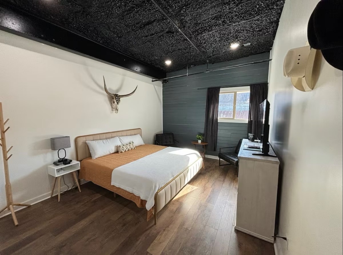 This classy unique place is top shelf! Originally a gallery, now featuring lofted ceilings, MCM chairs, 7 stained glass windows, premium appliances-Kitchen Aid+Sub Zero, great paintings, Marantz stereo and record player, West Elm rug, futon, entertainment center. Queen bed with custom headboard, two 60” TVs. Also solid oak countertops, coffee station and trim. Blackout shades and curtains, washer/dryer, 1.5 baths with Toto bidet and hardwood floors, dining table seats 6. Requires steps to enter