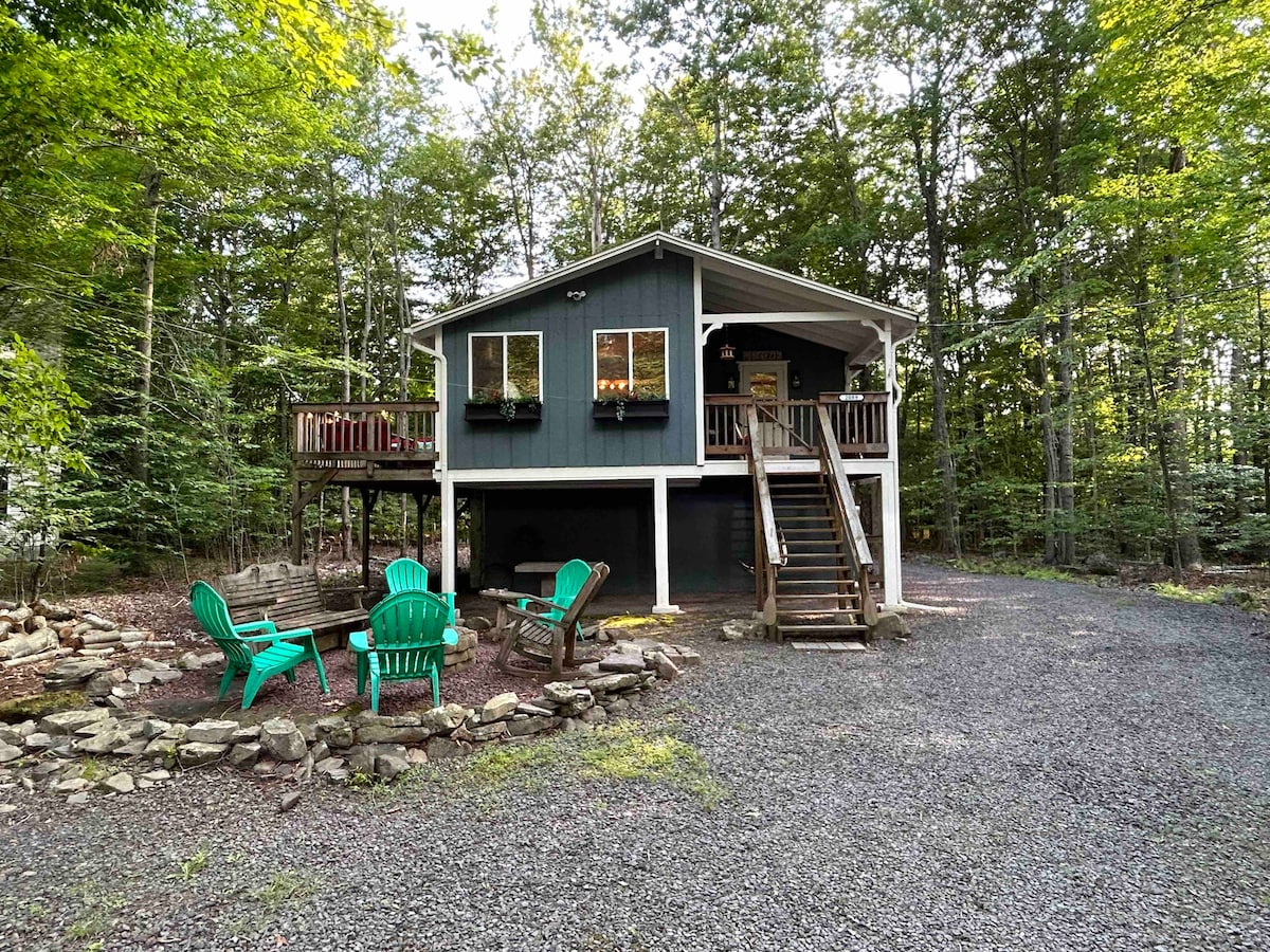 ☞Community Fees included ☞Private 10-person hot tub ☞Fireplace ☞Full pool table, ping-pong topper, arcade infinite table, board games ☞Firepit (wood included) ☞High-speed Wi-Fi ☞Fully stocked kitchen ☞BBQ grill ☞7 Mins to Austin T. Natural Area/hiking trails, waterfalls ☞20-30 mins to Kalahari water park, Camelback zip lines & (ski & snow tubing), Pocono Daytripper Wine Trolley, Jack Frost & Big Boulder ski Mountains, etc. ☞Pet friendly ☞Self check-in ☞King bed ☞On-site washer + dryer