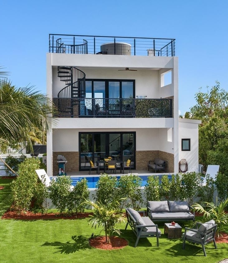 Márohu is a stunning 3-bedroom modern Caribbean villa set within the exclusive neighbourhood of Turtle Tail, just a 10-minute drive from the world-renowned Grace Bay Beach. This spacious, well-equipped, and family-oriented villa offers expansive floor-to-ceiling views over Flamingo Lake from every room. You’ll experience the best of outdoor living with our own pool and sandy beach, ideal for lounging, a friendly game of cornhole, or exploring the lake with our included kayaks.
