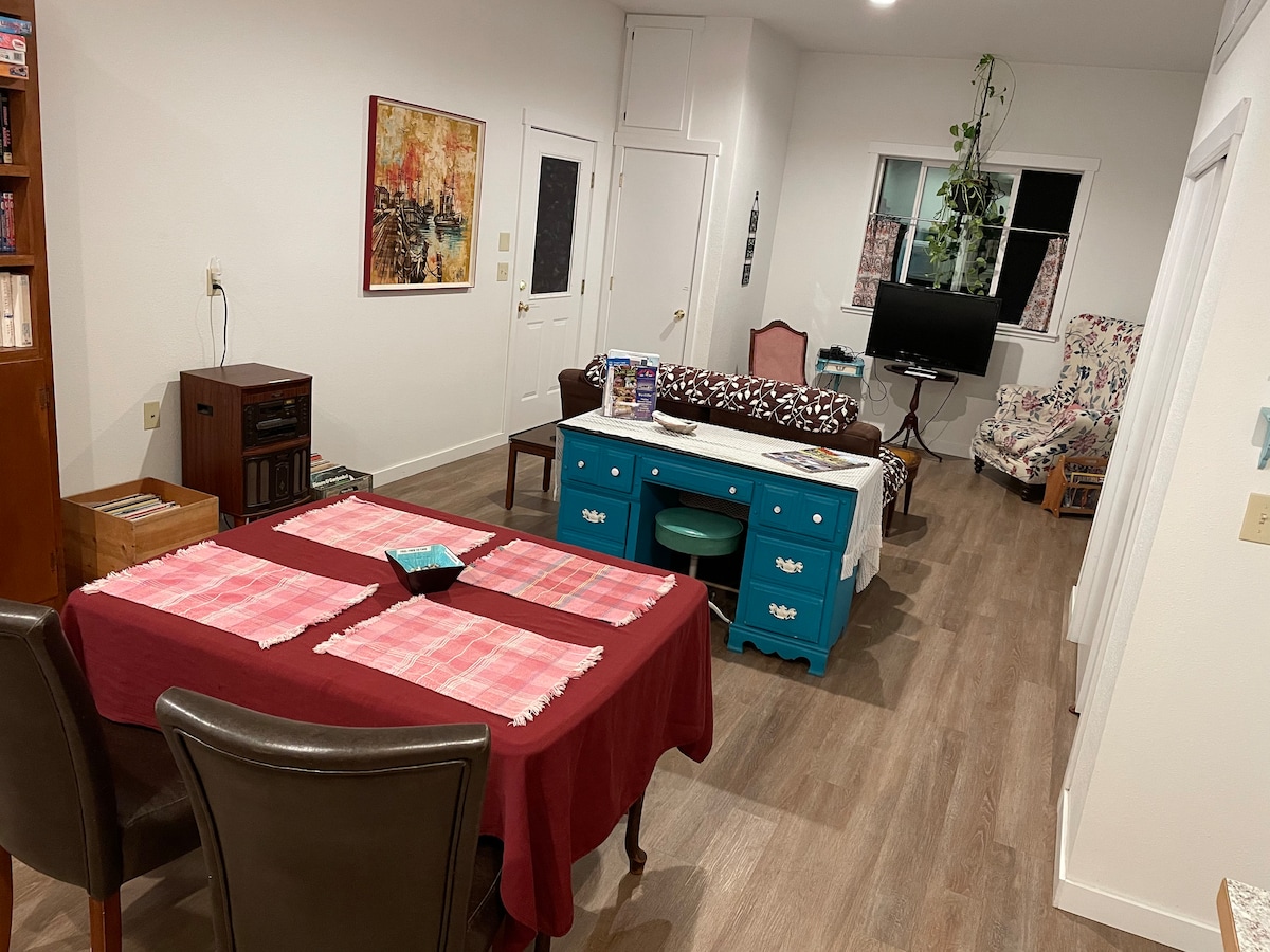 Very private, Charming 1905 1 Bedroom apartment in Mingus park neighborhood. Within walking distance of restaurants, coffee shops in downtown Coos Bay. Full Kitchen & Laundry. Wifi, TV with Netflix. Queen sized bed in private bedroom. Awesome 2 person comfy sofa in family room. Pack n’ play available for babies or cot available for older children or for extra guests. Pets allowed with previous discussion and small cleaning fee.