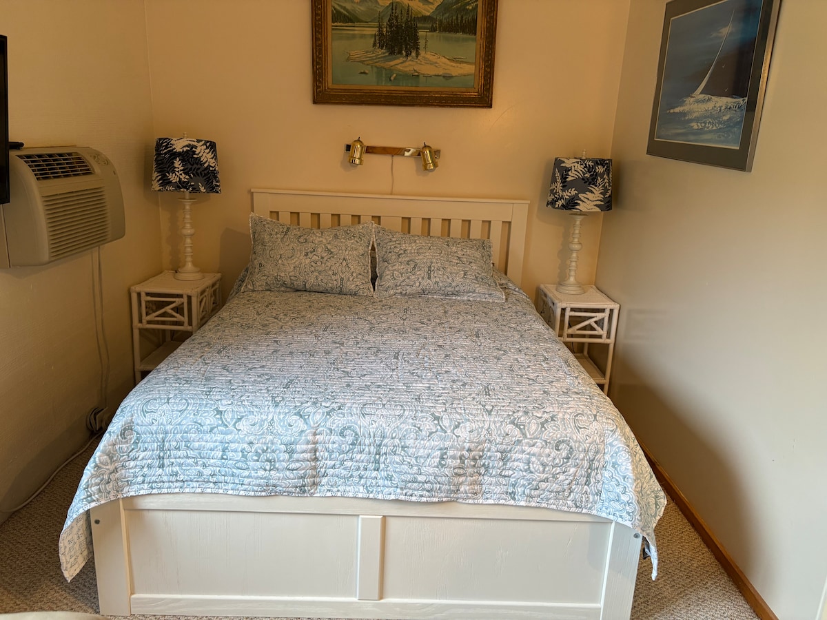 The top floor is a private primary suite with cathedral ceilings, offering a quiet retreat. Enjoy a king bed, fireplace, TV, and A/C, plus a private balcony with scenic mountain views. The bath features a 2-person jetted tub and separate shower. A convenient dry bar includes a mini fridge, microwave, and Keurig. Accessed by two flights of stairs. Located in Narvik or Oslo. 🛏️ King bed 🛁 Jetted tub & shower 🔥 Fireplace ❄️ A/C 🍷 Dry bar & Keurig 🚪 Private balcony 🪜 Stairs required
