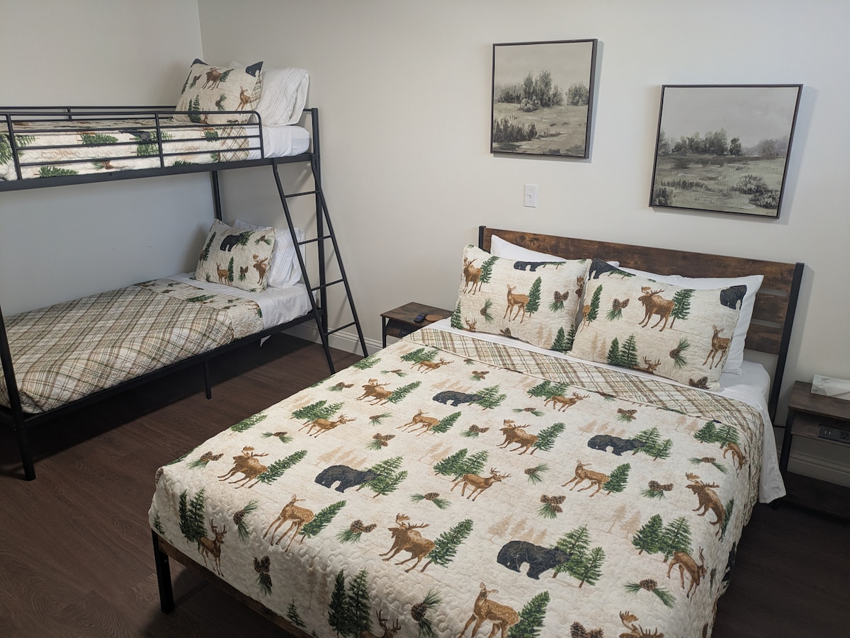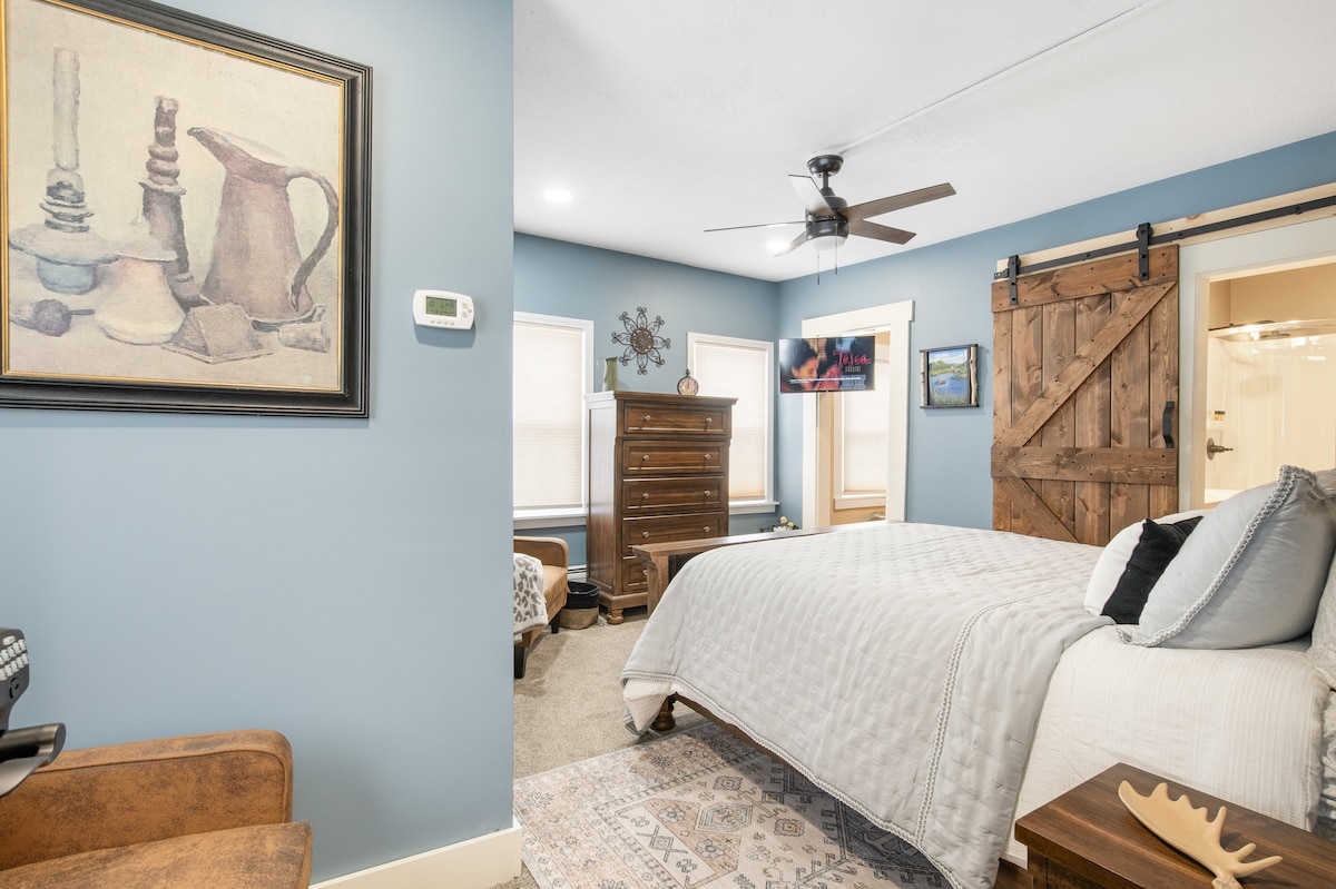 Welcome to "The Porch on Main" blue room. This beautiful luxury suite offers a queen bed with a private sitting room with smart tv (wifi onsite) and kitchenette area. Beautiful bathroom with spacious shower. Large parking lot with plenty of room for trailers and direct Atv and Snowmobile access from backyard. Well groomed 1.2 acre lot with panoramic mountain views. Walking distance to restaurants and shops.