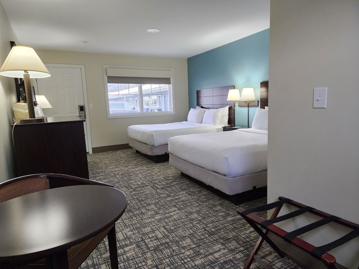 More hiking, more skiing, more shopping, more dining, and more fun – there’s something for everyone in the White Mountains, and The Inn & More is your friendly and reliable home base to do it all. Enjoy the ease and relaxation of this newly renovated New England escape, where classic roadside Americana meets modern convenience and comfort against the beautiful backdrop of the White Mountains and Saco River. This extra large room features two queen beds, fast wifi, mini fridge and microwave.