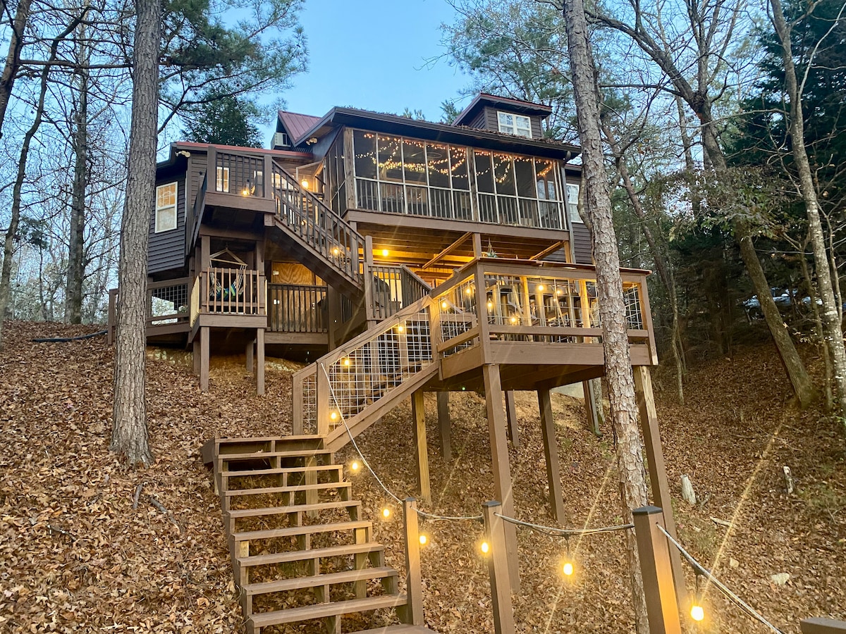 ESCAPE AND UNWIND at Perch! Sleep elevated in the trees at this lakefront treehouse located on Lake Mitchell. This very unique stay features a main house with a full kitchen, a separate bedroom accessed by a covered walkway, and a second floor porch which opens up for a fully immersed view of the sunset. Enjoy a large living space under the house with a TV, bed swing, and outdoor double shower. Hang out on your private dock and pass the day away on "Lake Time." You are sure to leave rested!