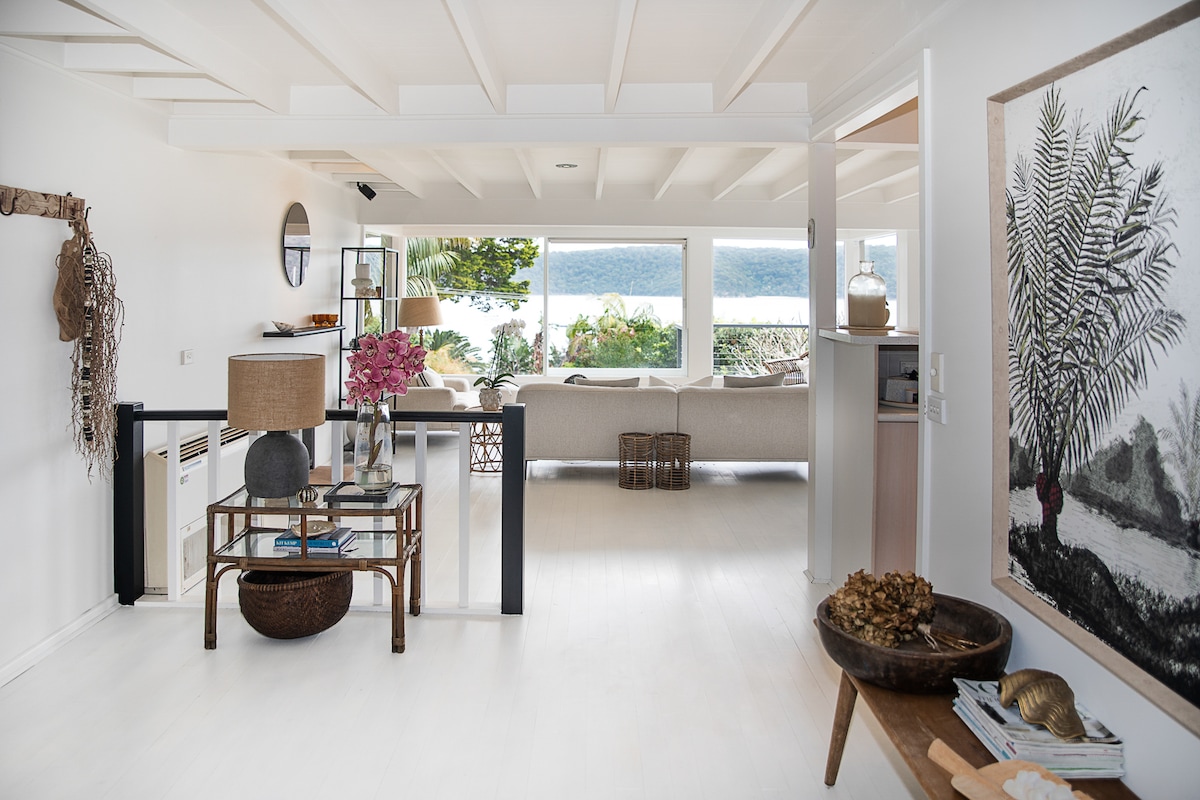Sitting On The Dock Of The Bay…is our tranquil designer-styled bay house. We believe it is the Central Coast’s best kept secret. At the end of a rain-forested road, our waterfront reserve retreat commands an unbeatable view over Phegan’s Bay, a little known, secluded waterway far from the hustle and bustle, yet close enough to dip into the Central Coasts many activities and services. You will wake up to the romantic sound of anchors clinking, birds chirruping, immersed in lifes simple pleasures.