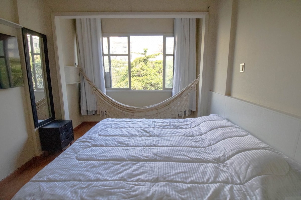 Enjoy a stunning and unique view of both the ocean and the mountain in a centrally located 2 bedroom renovated apartment in Leme, Copacabana ideal for families and couples. The apartment is cozy and has everything you need to make you feel at home. A very spacious and stylishly decorated living room, and a fully equipped apartment. One bedroom has a queen bed, the second bedroom has 2 single beds, and there are 2 more mattress/futons that can be placed in the living room if needed.