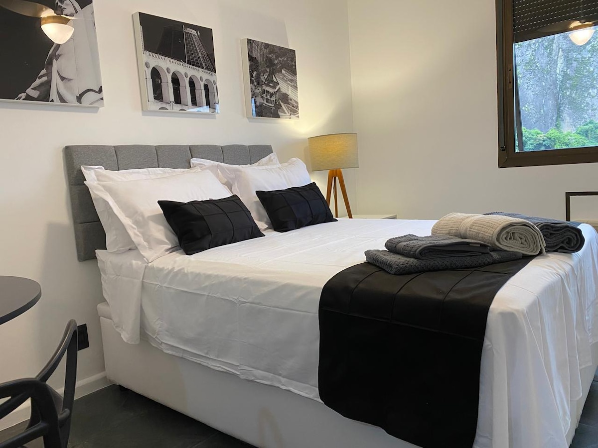 Attention lisez attentivement : Não fazemos desconto, por favor NÃO INSISTA Duplex studio neuf et désigné par un architecte : un seul lit double avec draps de qualité, un sofa convertible ( 1 place) et une Cuisine amenagée. Terrasse avec table et chaises. Immeuble de luxe avec salon et salle à manger collective, terrasse de Home Office avec wifi, laverie avec 4 machines à laver/sécher et Roof Top avec piscine collective et vue sur le Christ Redentor