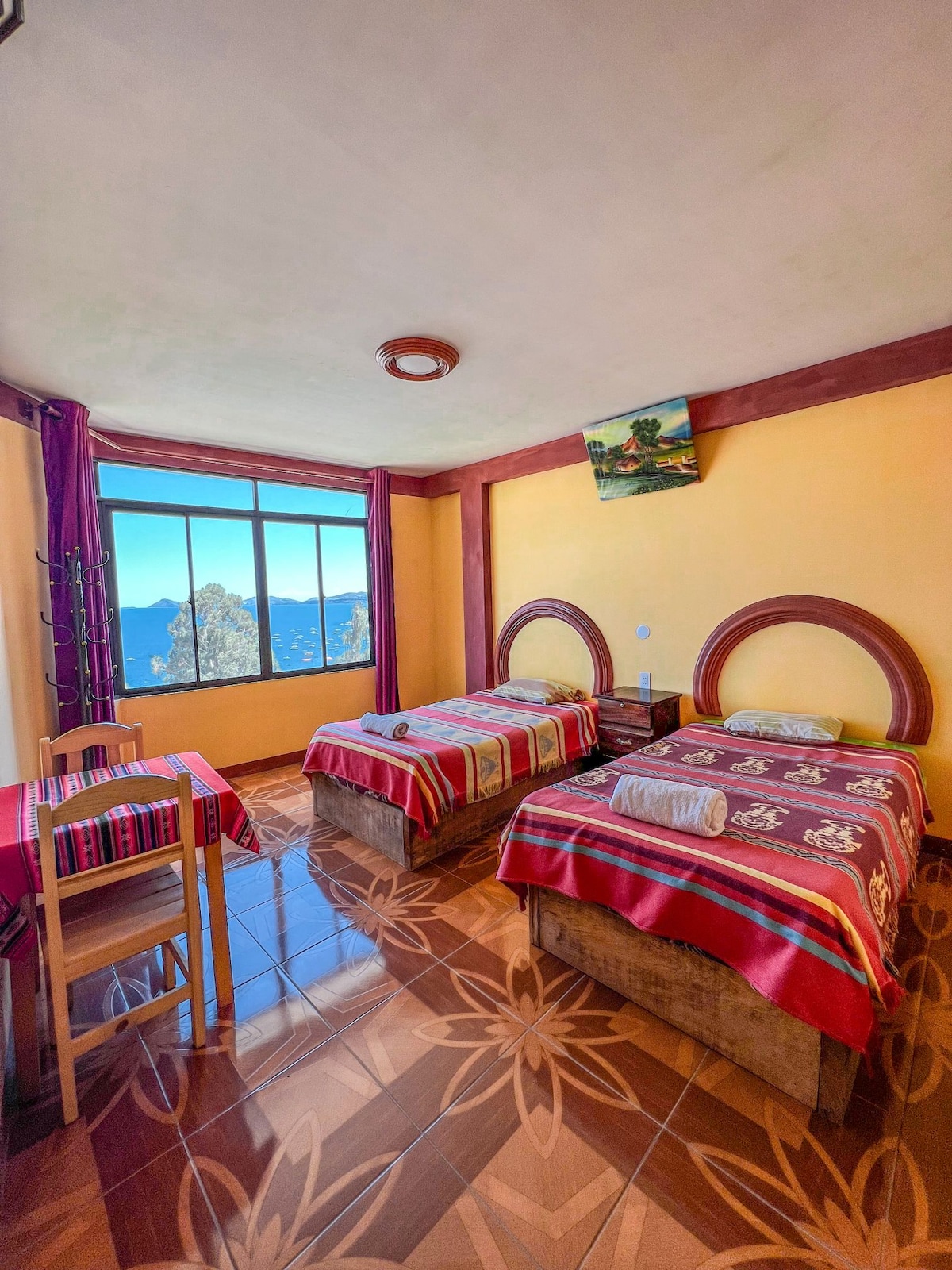 Disfruta de una estancia cómoda y acogedora en esta amplia habitación con ubicación privilegiada cerca a la avenida principal 6 de Agosto y el embarque para la Isla del Sol. 🛏️ Lo que ofrece la habitación: • Cama queen size • Decoración mural pintada a mano con inspiración costera mediterránea • Área de estar con mesa redonda para trabajo. • Baño privado y TV Cable • Calefacción para climas fríos • Hervidor eléctrico 📍 Ubicada en el Hotel Lago Azul. ¡Reserva ahora!