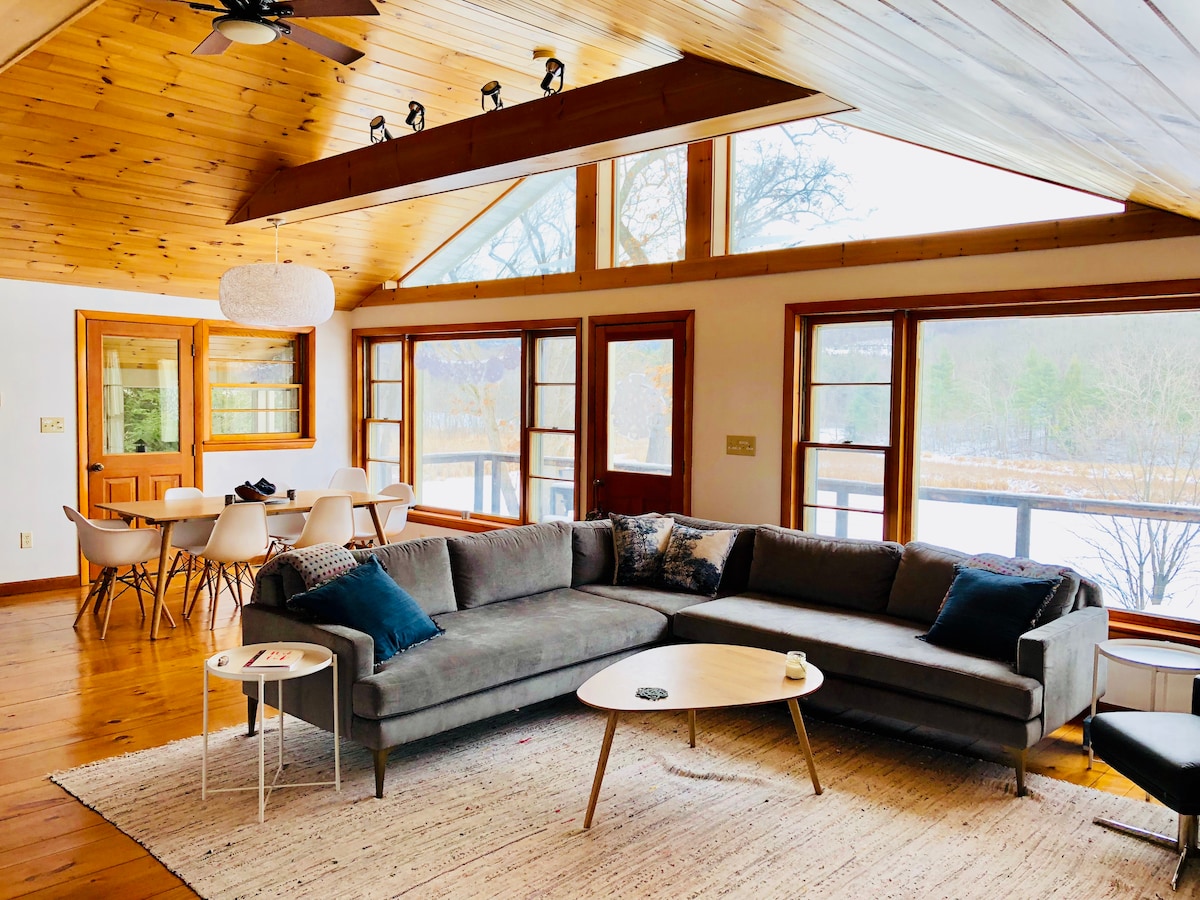 Escape to our recently renovated guest house on a 12-acre property, 15min from Hudson. Take in the rural setting through oversized glass doors. Infared Sauna is within running distance of the swimming pond for a cold plunge. Located in a park like setting of rolling hills & colorful sugar maple trees. Fully equipped kitchen, memory foam mattress and all the amenities. In home Massage/Yoga available. XC ski from the house! 45min to downhill.