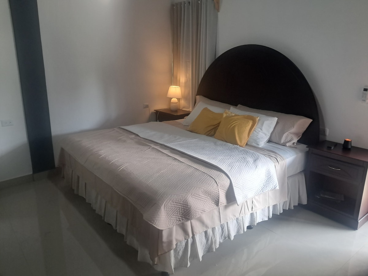 Gorgeous suite apartment exceeding all comforts... Firm pillow top mattresses, clean soft bedding, hot shower, cable TV, Wi-Fi, AC, Fridge, cooking stove, ceiling fans, microwave, living room set, balcony with mountain view, private parking, and most definitely hygiene.