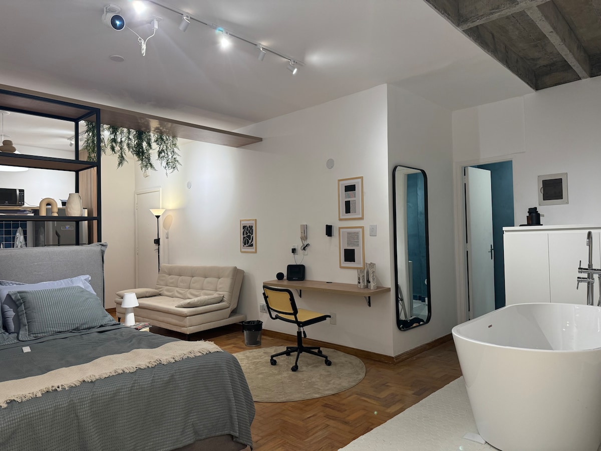 Estúdio espaçoso com muito design, arquitetura e a melhor vista de São Paulo. Loft completo! Com cama queen, closet, ar condicionado silencioso, cozinha completa, home office, WI-FI, TV 55” e uma belíssima banheira de imersão, de onde pode apreciar o seu drink preferido e curtir uma vista apaixonante. São Paulo toda estará há poucos minutos de você. Acesse o metrô andando apenas 200m. Reserve com tranquilidade! Proporcionaremos uma excelente hospedagem e uma ótima experiência!