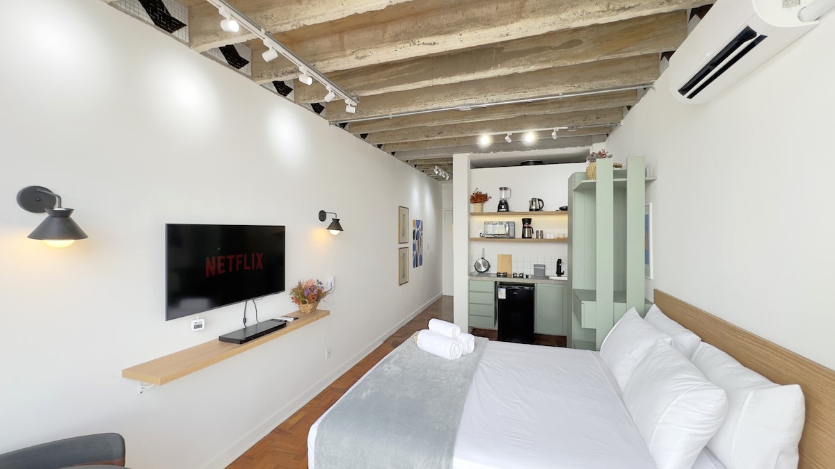Hospede-se no icônico Edifício Copan com vista incrível do 27º andar! Studio completo com tudo que você precisa para uma estadia inesquecível no centro de São Paulo. Lembrando que a água da torneira da cozinha é filtrada. ✨ Cama Queen size 📺 Smart TV de 50” 🍽 Cozinha equipada 💧 Água filtrada 🌆 Vista livre, sem tela de proteção Perto dos melhores restaurantes e dos principais pontos turísticos. Viva por dentro o prédio residencial mais famoso do Brasil — obra-prima de Oscar Niemeyer.
