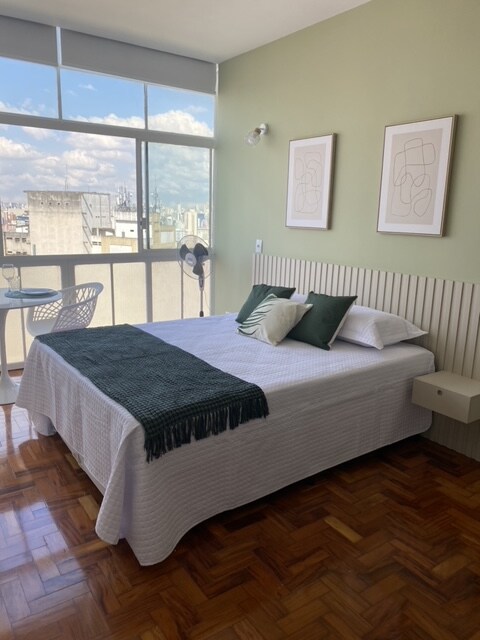 Mini apartamento aconchegante sobre a cidade, localizado no 23º andar, com 21 m², no lugar mais legal da cidade, ao lado do COPAN e metrô República. Estacionamentos 24hs bem perto. Check in às 14:00h check out às 12:00h, flexibilizados caso o apto esteja livre ou estadias acima de 6 dias. Aos domingos late check out às 20:00h. Cama queen, terraço, ar condicionado e ventilador de teto. Bancada de trabalho. Smart TV. Lavanderia no prédio. Armário e gaveteiro para roupas. Aceito o seu pet :)
