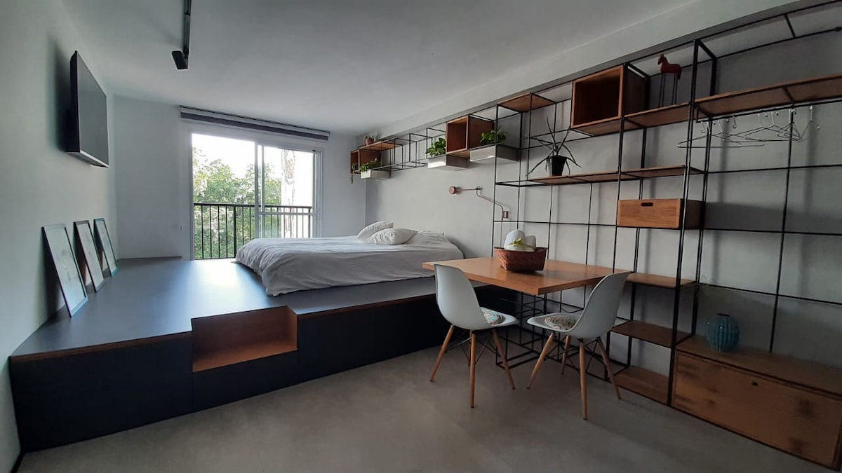Se você gosta de luz natural, este estúdio na Vila Madalena é o lugar perfeito. Localizado no primeiro andar, em uma rua tranquila, a poucos passos de um lindo parque e de todos os bares, restaurantes, galerias de arte e música ao vivo que a Vila Madalena tem a oferecer. O estúdio possui cama de casal, armário, área de trabalho, TV de 43", Kitchenette, AC, e água quente no banheiro. O complexo de apartamentos possui piscina infinita, lavanderia, fogueira, recepção 24 horas e área comum.
