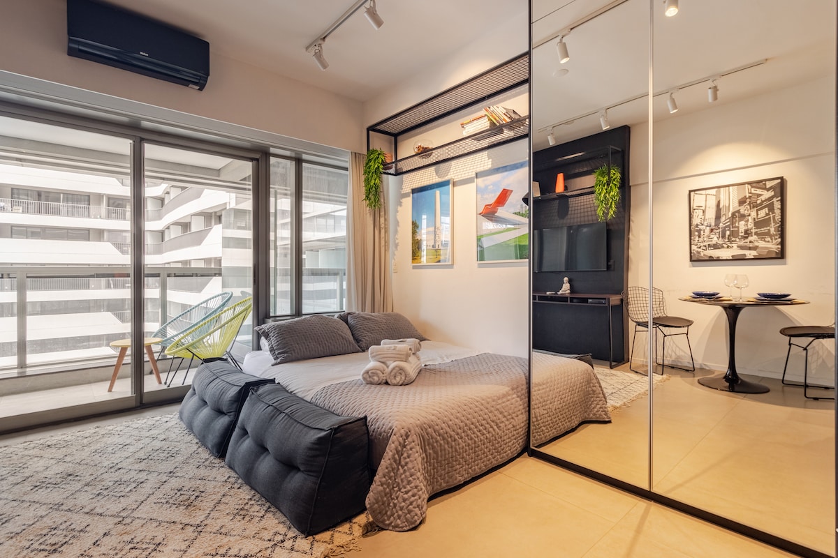 Stylish 50 m² apt. located at Bela Vista, has 24hr doorman. 2 bedrooms (only 1 with AC, and queen bed, the second one is quite small and can be used as an office, fitting a double-sized sofa-bed) and 1 bathroom. With amazing views from every window, it is a great place to work and relax. The private jet-tube at the balcony is a fantastic spot to enjoy the city views. Ideal for couples, professionals or small families looking for comfort, convenience, and one of the best views in the city.