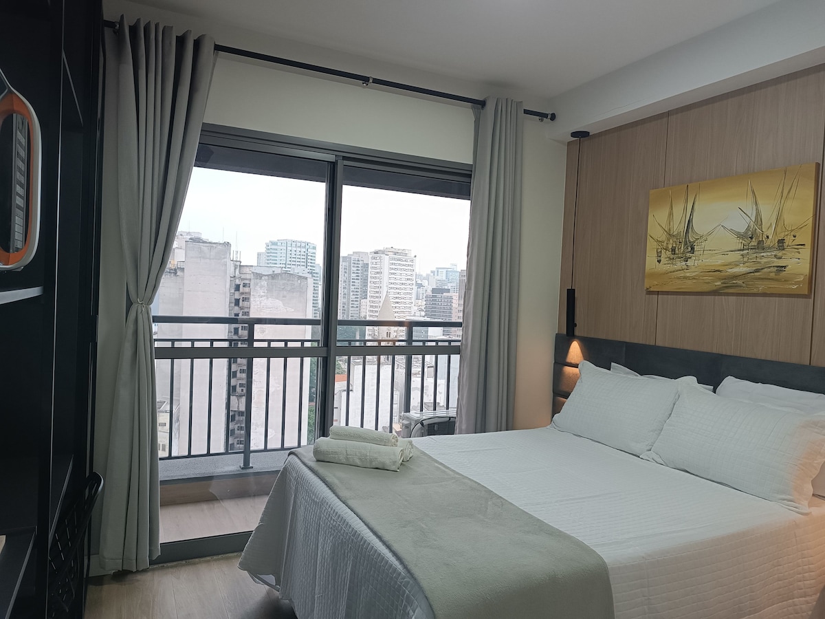 Studio novo com Ar Condicionado frio e quente. Colchão com PILLOW TOP para uma boa noite de sono Área de trabalho com TV. Geladeira, forno, micro-ondas, cooktop, coifa, e utensílios para sua comodidade A 300 mts do metrô República, ao lado do Copan, Edifício Itália, Bar da Dona Onça, Hot Pork, Sorveteria do Centro, Tokyo, e Mackenzie. Estando a curta distância do Farol Santander, Bar Brahma e Teatro Municipal.
