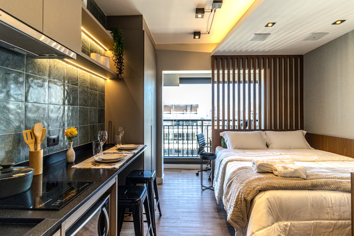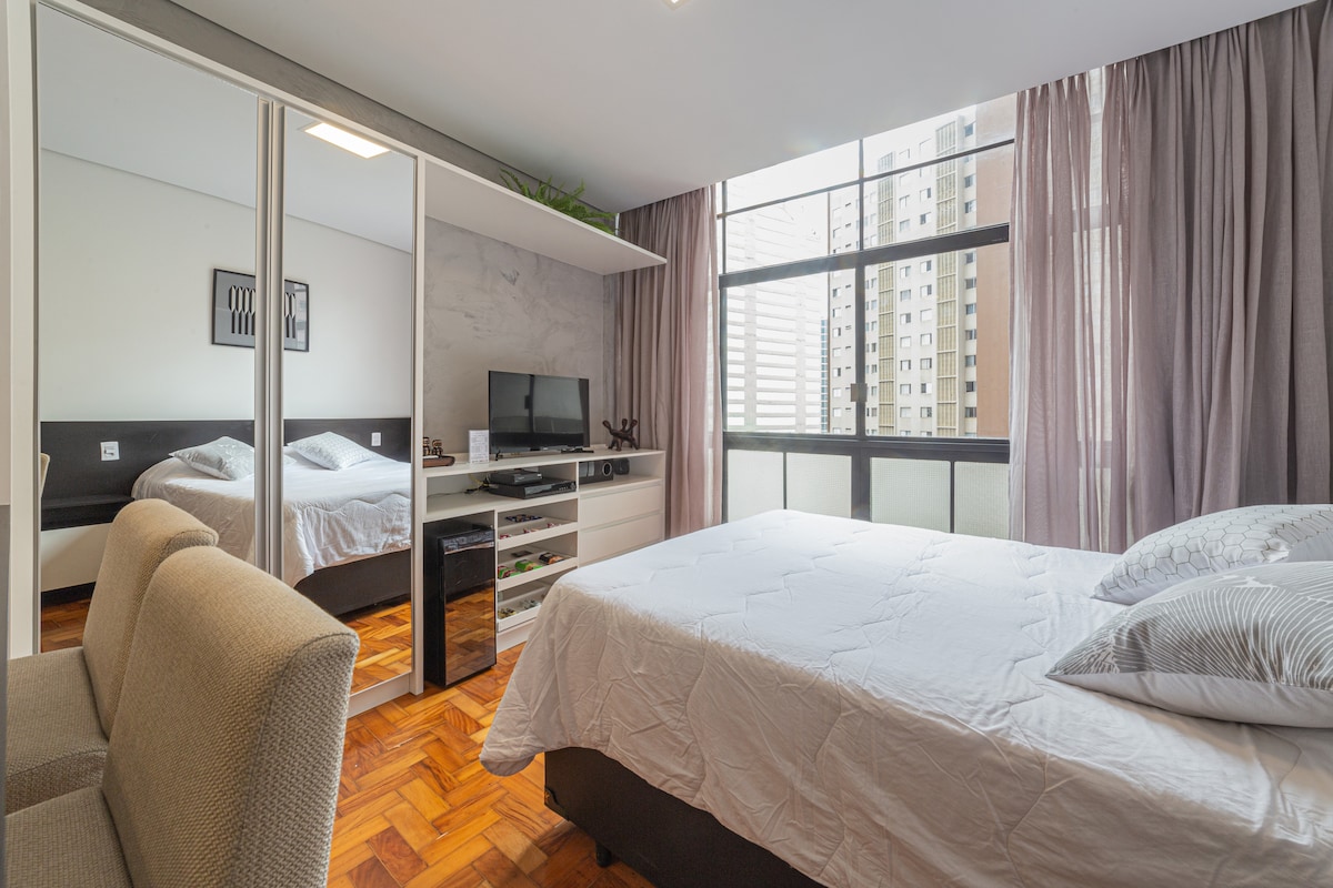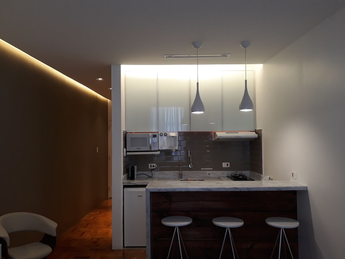 Studio novo com Ar Condicionado frio e quente. Colchão com PILLOW TOP para uma boa noite de sono Área de trabalho com TV. Geladeira, forno, micro-ondas, cooktop, coifa, e utensílios para sua comodidade A 300 mts do metrô República, ao lado do Copan, Edifício Itália, Bar da Dona Onça, Hot Pork, Sorveteria do Centro, Tokyo, e Mackenzie. Estando a curta distância do Farol Santander, Bar Brahma e Teatro Municipal.