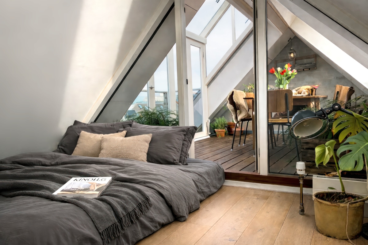 Bright Nordic penthouse with two private sunny terraces and daylight all day. A calm, personal home with strong light in Nordhavn’s raw and modern city life. Located on the 5th floor and accessed by stairs – rewarded with extra light and privacy above the rooftops. Cafés, harbour bathing and local life are just around the corner, and the S-train is a 2-minute walk away with fast connections to the city centre. Renovated by a Danish architect and styled by a Danish designer.