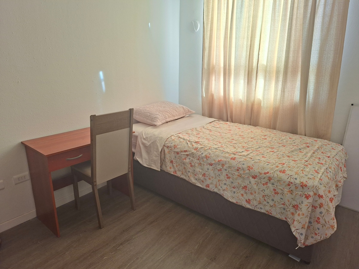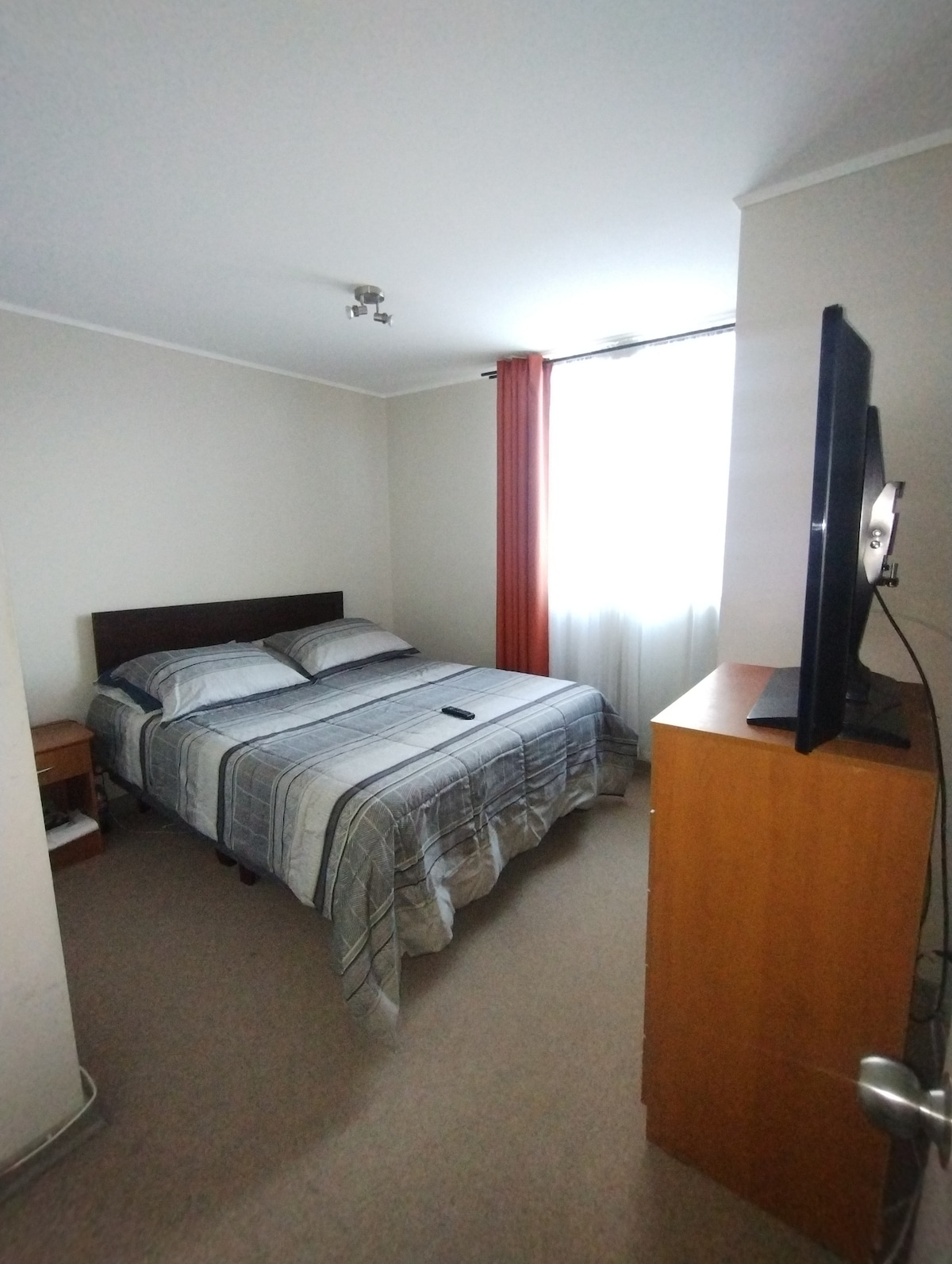 Descansa como te mereces en este espacio cómodo y tranquilo. Tiene dos dormitorios, uno con una cama de 2 plazas y el otro con una de plaza y media, un baño, cocina independiente completamente equipada, logia con lavadora y secadora, balcón, wifi y Smart TV con Netflix. Acceso vehicular expedito a 10 minutos del centro de la ciudad. Estacionamiento gratuito cerrado. Se proporciona té, azúcar, endulzante, sal aceite, condimentos y agua de bidón de cortesía. A 10 minutos del centro de la ciudad.