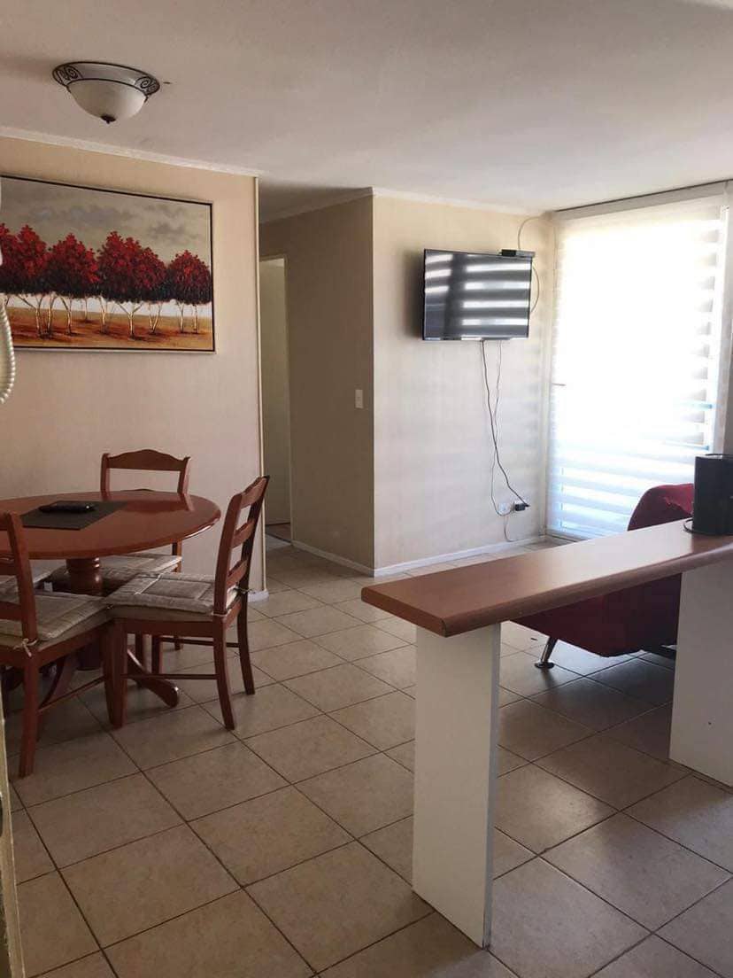Departamento para 3 personas, ideal para una estancia de trabajo o descansar mientras vamos de paso Cocina amoblada Una habitación con cama de dos plazas y televisor, otra habitación pequeña con cama de una plaza Sala pequeña con Smart TV con varias aplicaciones para pasar el rato, Wifi, Estacionamiento Supermercado Jumbo a dos cuadras Casino a pocos minutos El departamento cuenta con lavadora de ropa Flexibilidad de entrada o salida si el calendario lo permite Factura para empresas